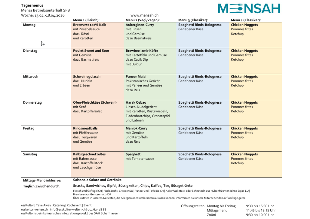 Die Mensah wird von den Mitarbeitenden der essKultur betrieben. Die essKultur und die Mensah sind ein Integrationsprojekt des Schweizerischen Arbeiterhilfswerk SAH Schaffhausen.
