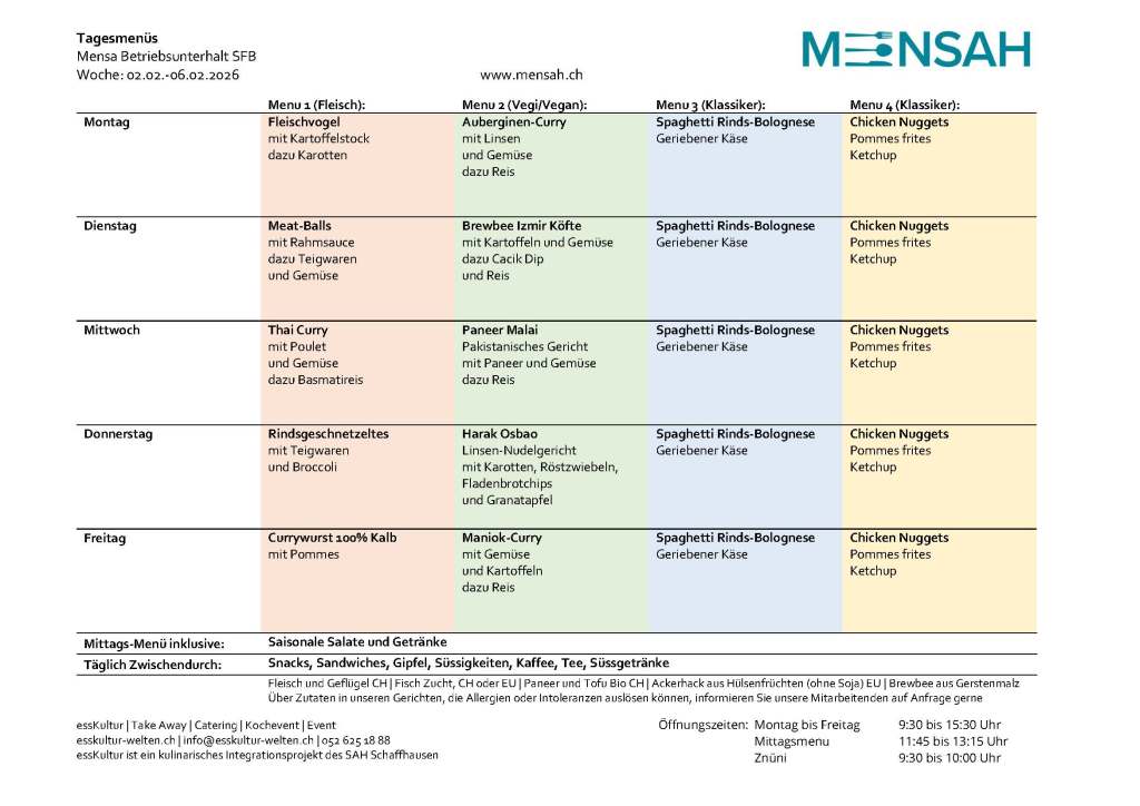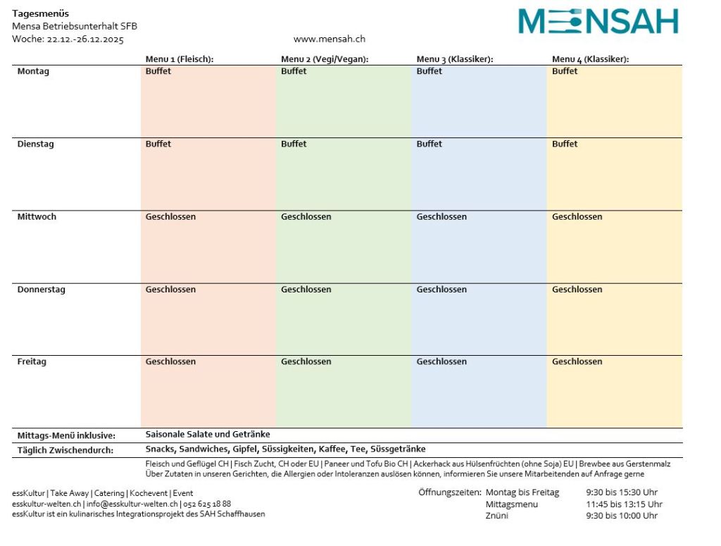 Die Mensah wird von den Mitarbeitenden der essKultur betrieben. Die essKultur und die Mensah sind ein Integrationsprojekt des Schweizerischen Arbeiterhilfswerk SAH Schaffhausen.